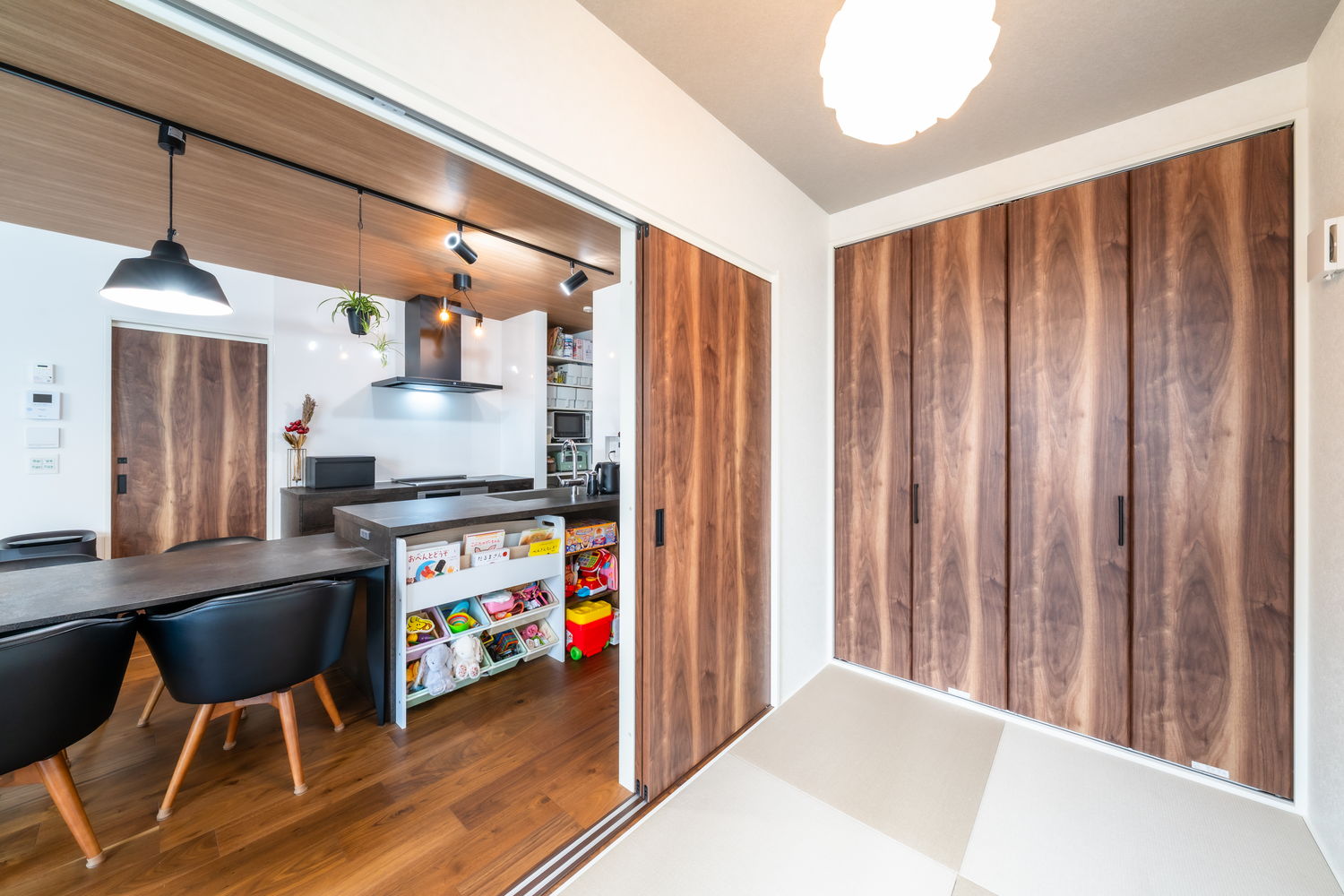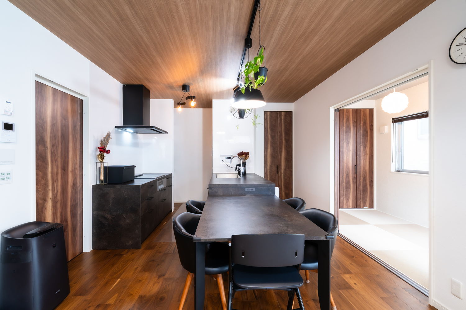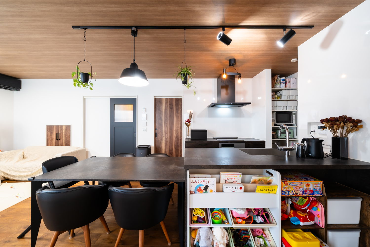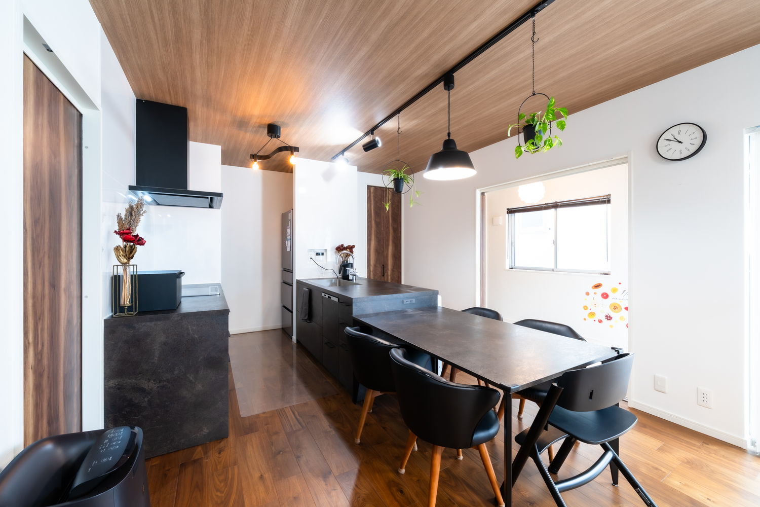 妊娠中だったこともあり、大きな変更はせずに、生活動線を意識してキッチンの配置を工夫しました。テーブルを置けるようにレイアウトを縦にし、調理しながら家全体を見渡せるようにしたのは大きなポイントです。将来子どもと一緒に料理ができるようにとの思いもありました。外観はウッド調やアクセント柄を選び、内装はInstagramを参考にしながらグラフテクトに合う色味や家具を意識しました。