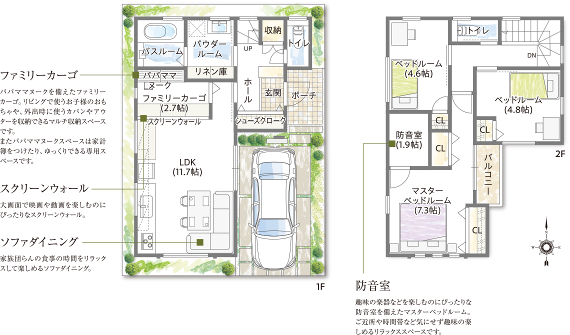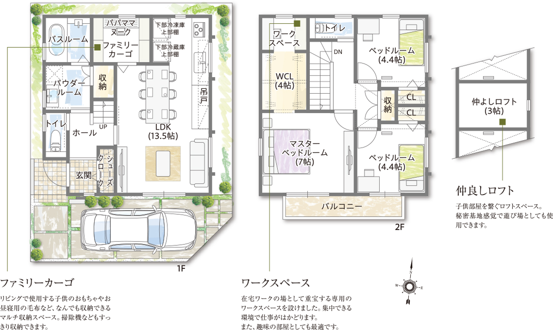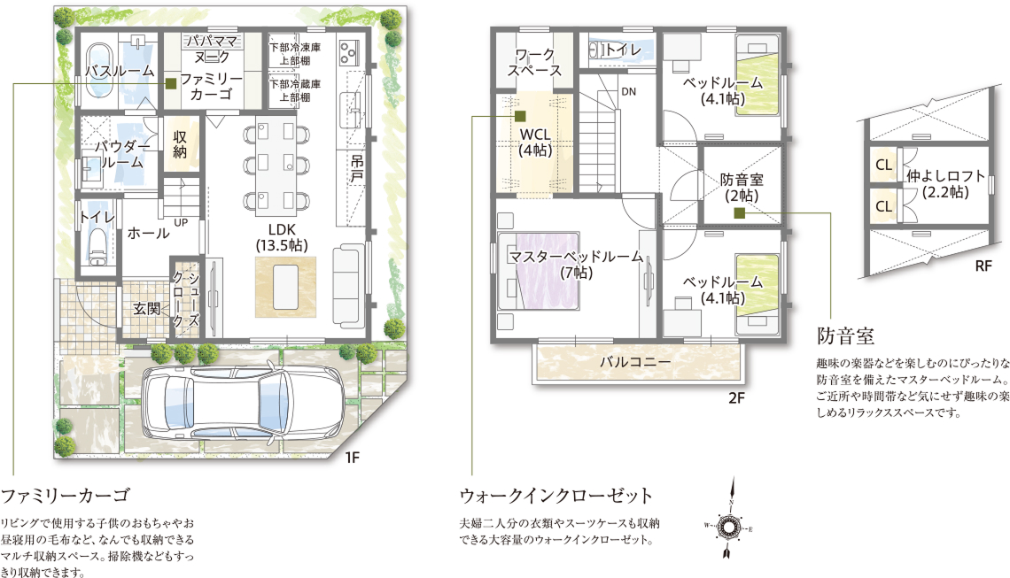 充実したキッチンとダイニング、ファミリーカーゴやウォークインクローゼットなど多彩な収納はママを笑顔にし、在宅ワークができるワークスペースはパパのお気に入り。防音室や仲よしロフトは、お子様もゴキゲンなアイデアです。