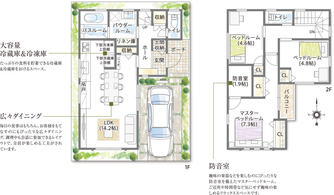 楽しく機能的なビッグダイニング食卓を中心に「食べて、語らう」家族の寛ぎを提案するビッグダイニングのあるプランです。効率的な配置で大容量の冷蔵庫や冷凍庫も設置できます。随所の収納も充実させ、二階には楽器の演奏を思う存分できる防音室も設けました。