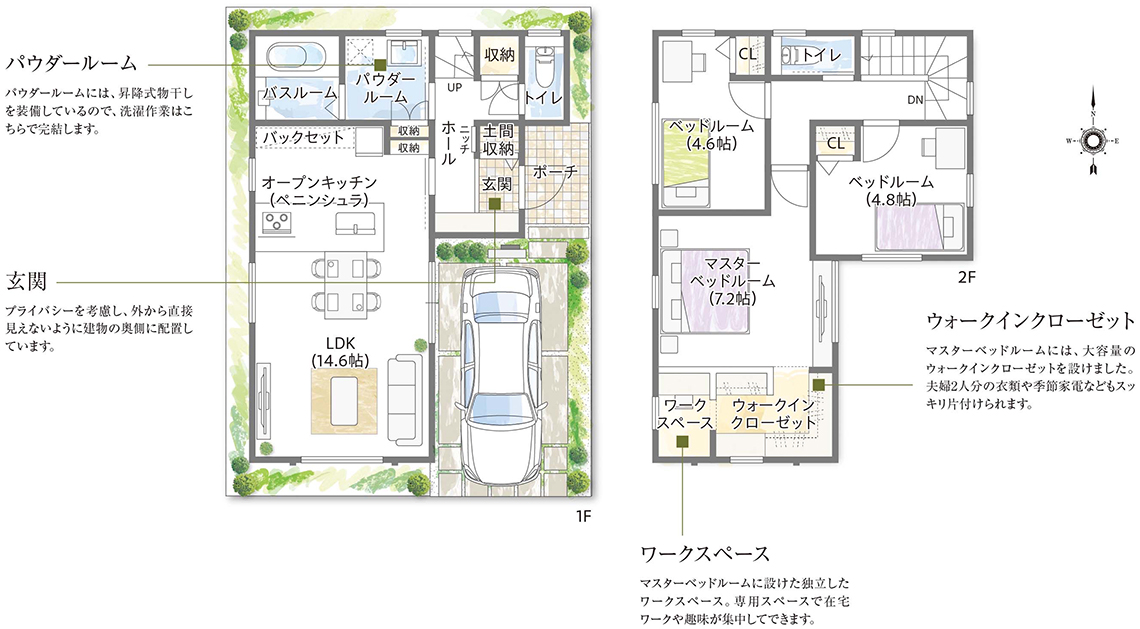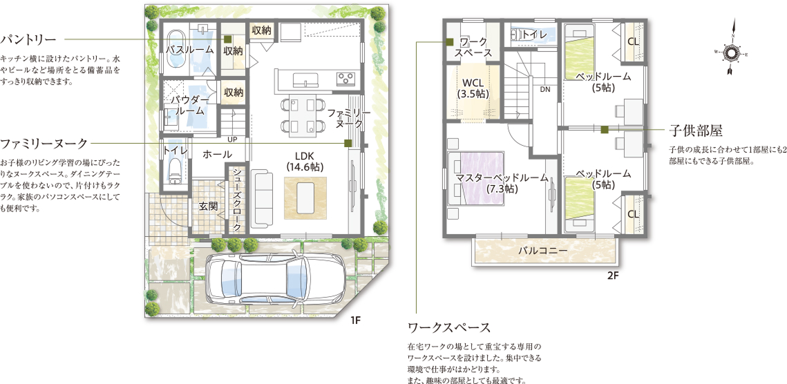 1階はファミリーカーゴを備え、冷蔵庫置場にも配慮した機能充実のリビングが自慢。2階は専用ワークスペースとウォークインクローゼットを設置した主寝室が快適です。子供部屋をつなぐ仲よしロフトはお子様にうれしい空間です。