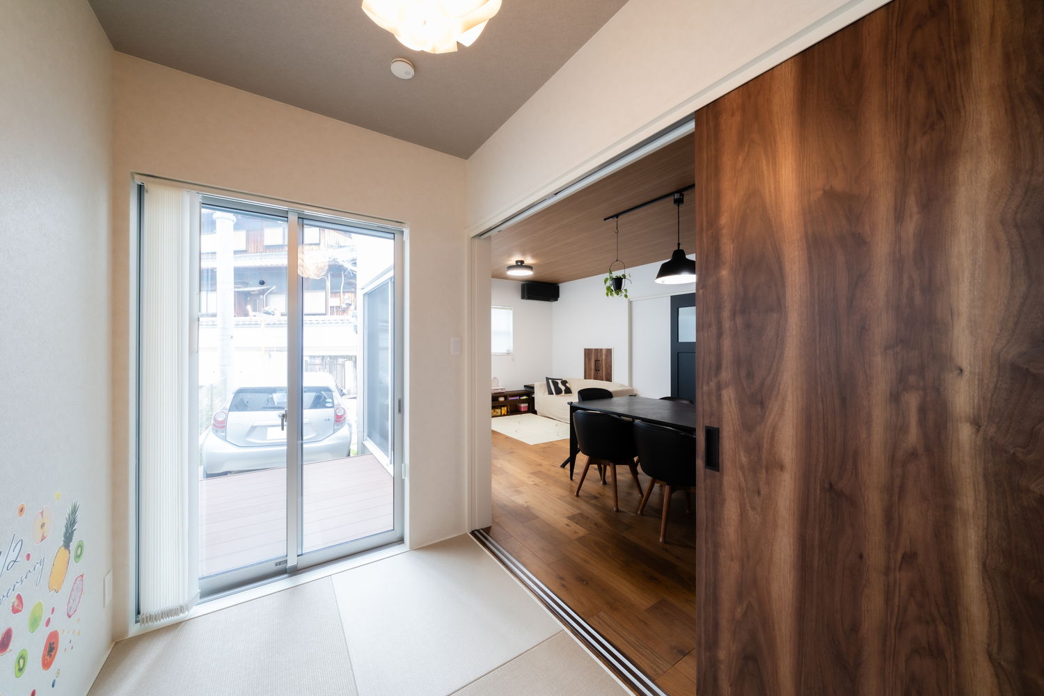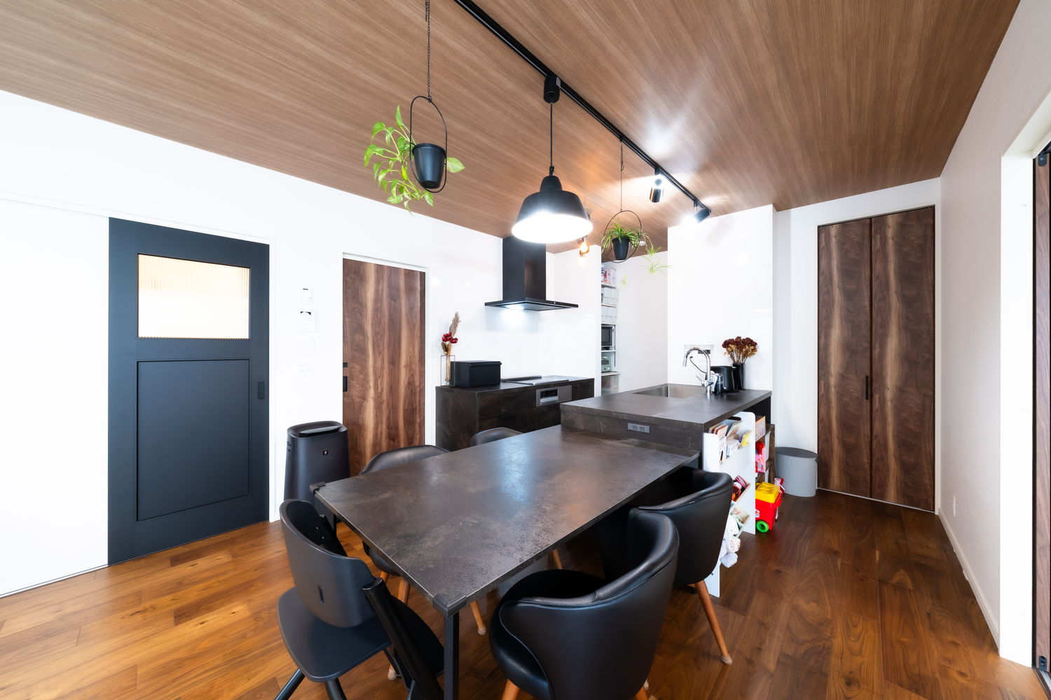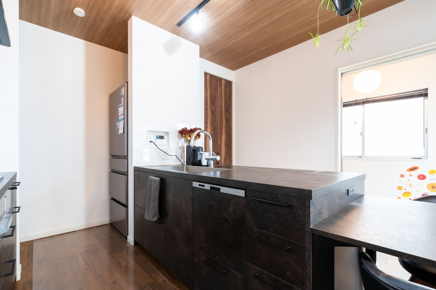 妊娠中だったこともあり、大きな変更はせずに、生活動線を意識してキッチンの配置を工夫しました。テーブルを置けるようにレイアウトを縦にし、調理しながら家全体を見渡せるようにしたのは大きなポイントです。将来子どもと一緒に料理ができるようにとの思いもありました。外観はウッド調やアクセント柄を選び、内装はInstagramを参考にしながらグラフテクトに合う色味や家具を意識しました。